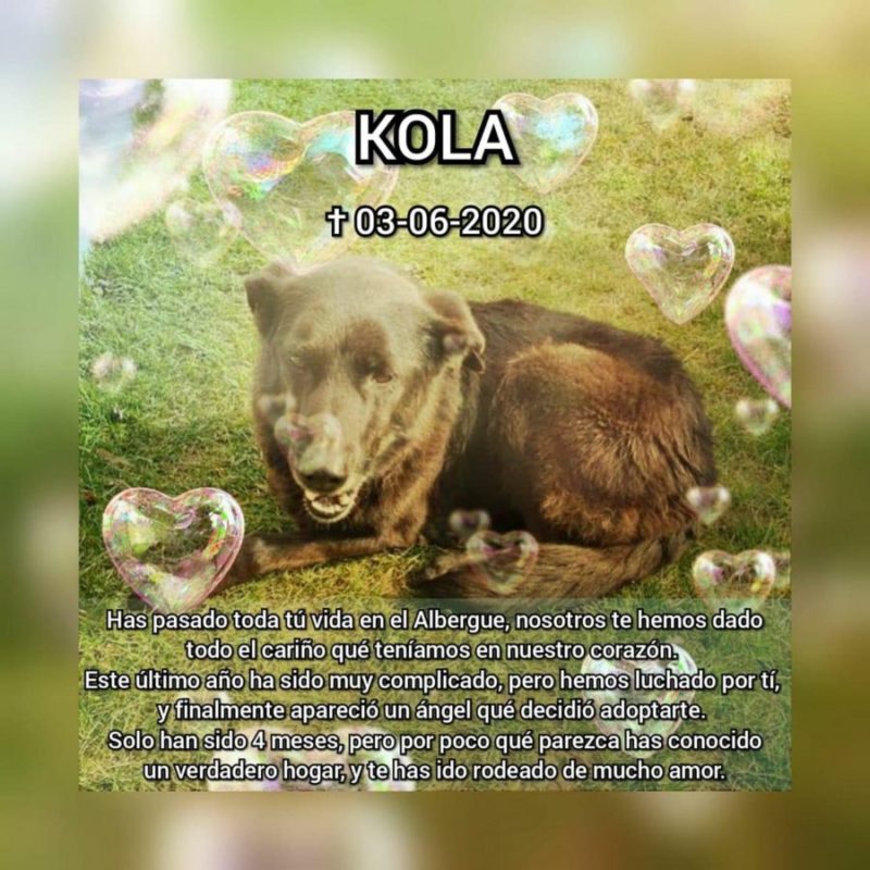 Nos amis bénévoles de la Esperanza se joignent à nous pour te remercier. Un grand merci à nos amis de la Esperanza qui se sont occupés de Kola de nombreuses années, de l’avoir aimé et soigné pendant tout ce temps, ils ont espéré 8 ans que quelqu’un craque pour ce gentil chien.