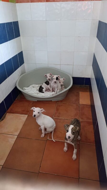 Bonachon, Adriana, Pinto, Snowwhite, et Emilia ont été trouvés un jour de pluie dans une boîte avec une couverture près d’une station-service. Leur ventre était gonflé en raison de vers intestinaux, ils ont été vermifugés et sont maintenant en grande forme.
